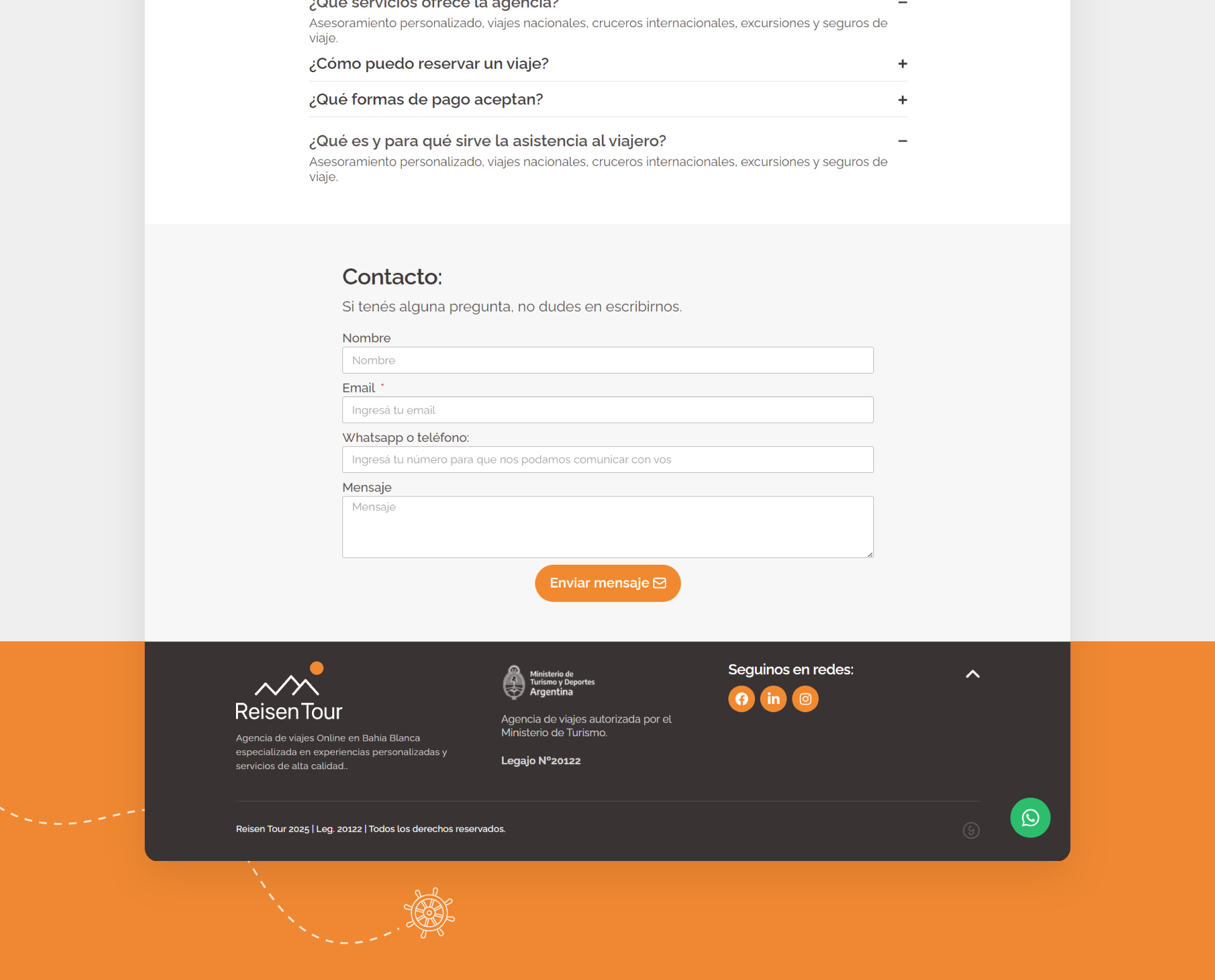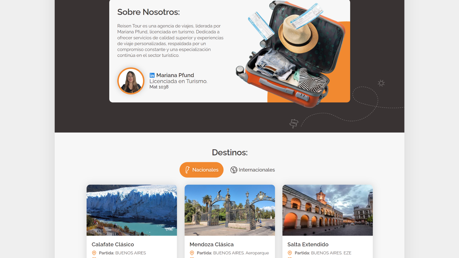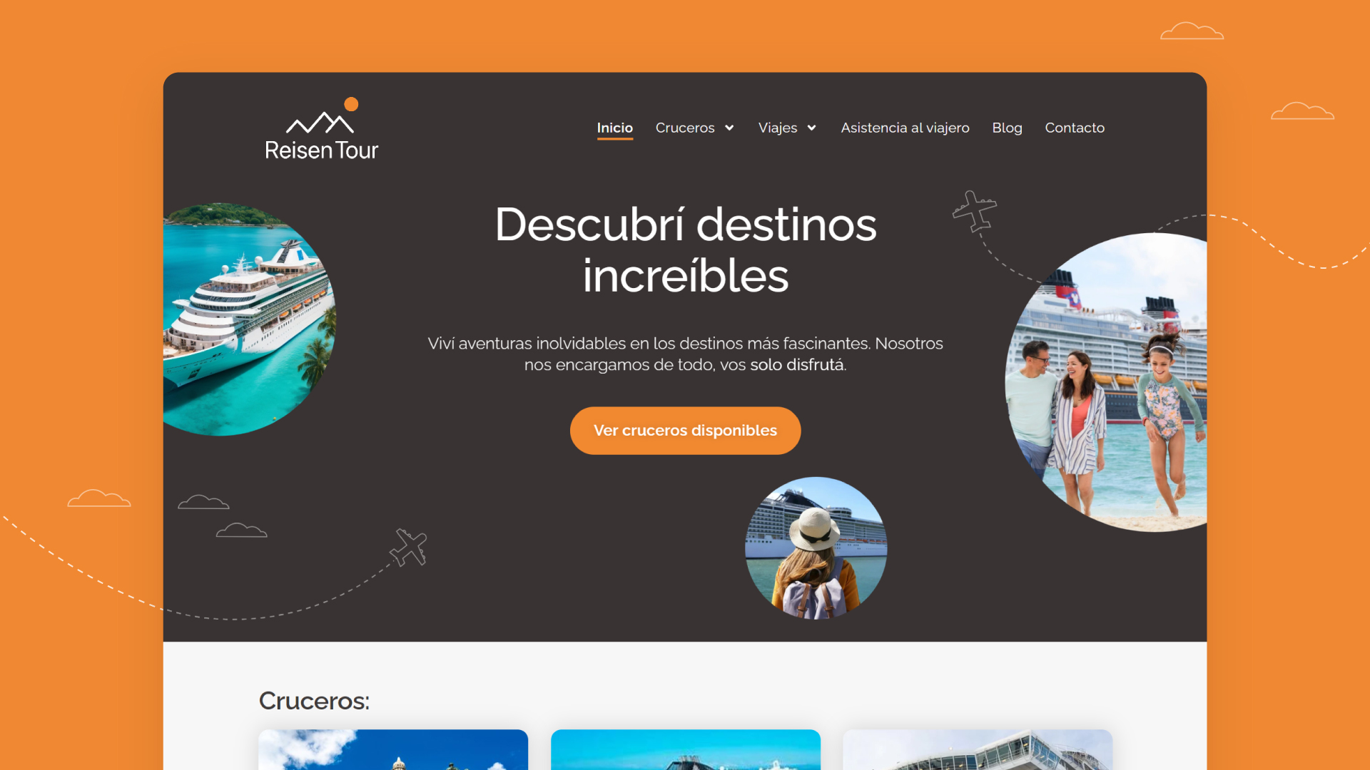 Mariana necesitaba un sitio web para su agencia de viajes. Ya contaba con un logo, y a partir de él desarrollamos un universo visual simple y coherente con la marca. Luego, diseñamos el prototipo y lo llevamos a WordPress, donde implementamos un dashboard personalizado que permite cargar fácilmente los distintos paquetes turísticos que ofrece Reisen Tour.